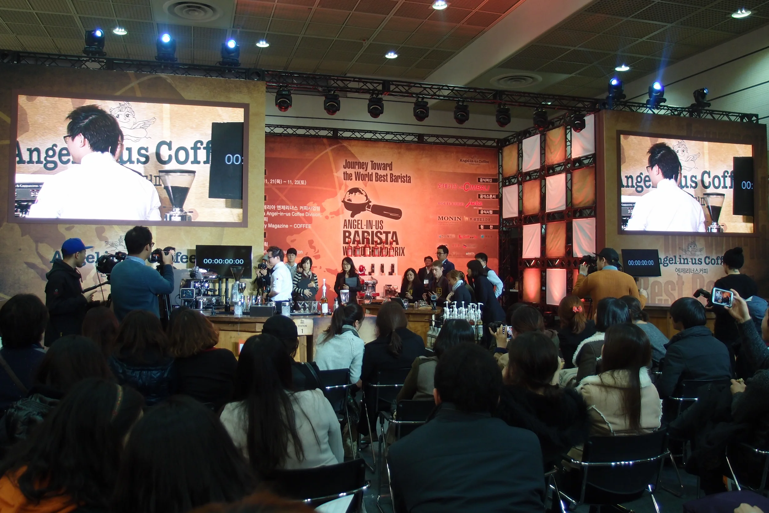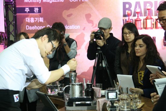 The next morning, after a short sleep and a hearty breakfast, we reported to the massive Coex exhibition hall for a short calibration session prior to the start of the competition. The ABWG was somewhat different than competitions I have judged in the past, partly because it had a more commercial feel. The ABWG’s elaborate stage and audio-visual setup, the elegant hostess, and the two huge HD screens showing the live feed made the competition feel like a big made-for-TV event.Six baristas from Korea and six international baristas competed. Most of the Korean competitors were top finishers in the Angel-in-us Korean championship, held earlier in the year. The lineup included Juwon Park (the champion), Seung Kyu Park, Wonmi Park, Dongho Seo, Hee Do Jung, and Jeong Mi Choi. All had several years of experience as baristas.